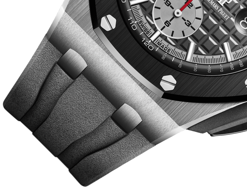 Slate grey dial with “Méga Tapisserie” pattern, rhodium-toned counters, white gold applied hour-markers and Royal Oak hands with luminescent coating, slate grey inner bezel.