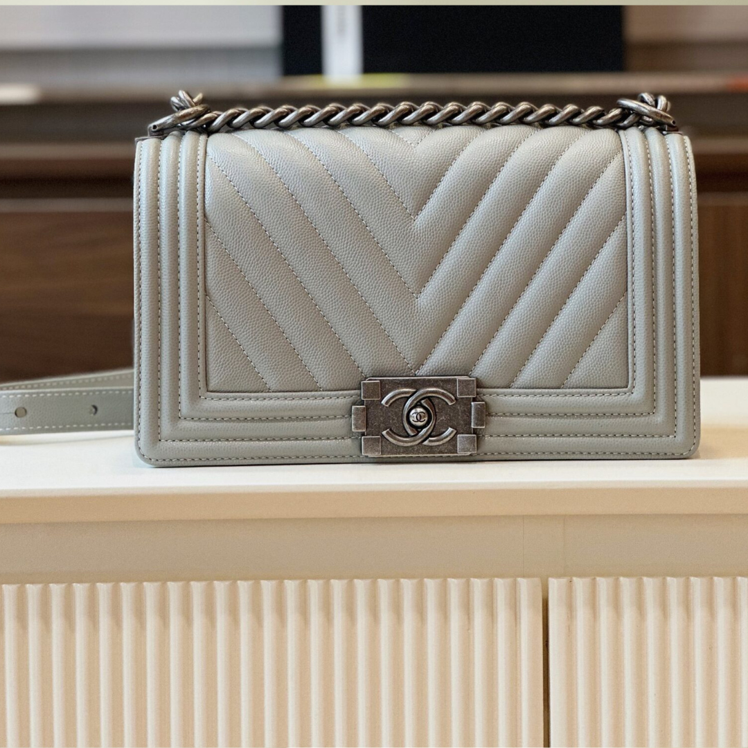 • Chanel Boy Medium Handbags Grey Leather With Silver Lock 25cm