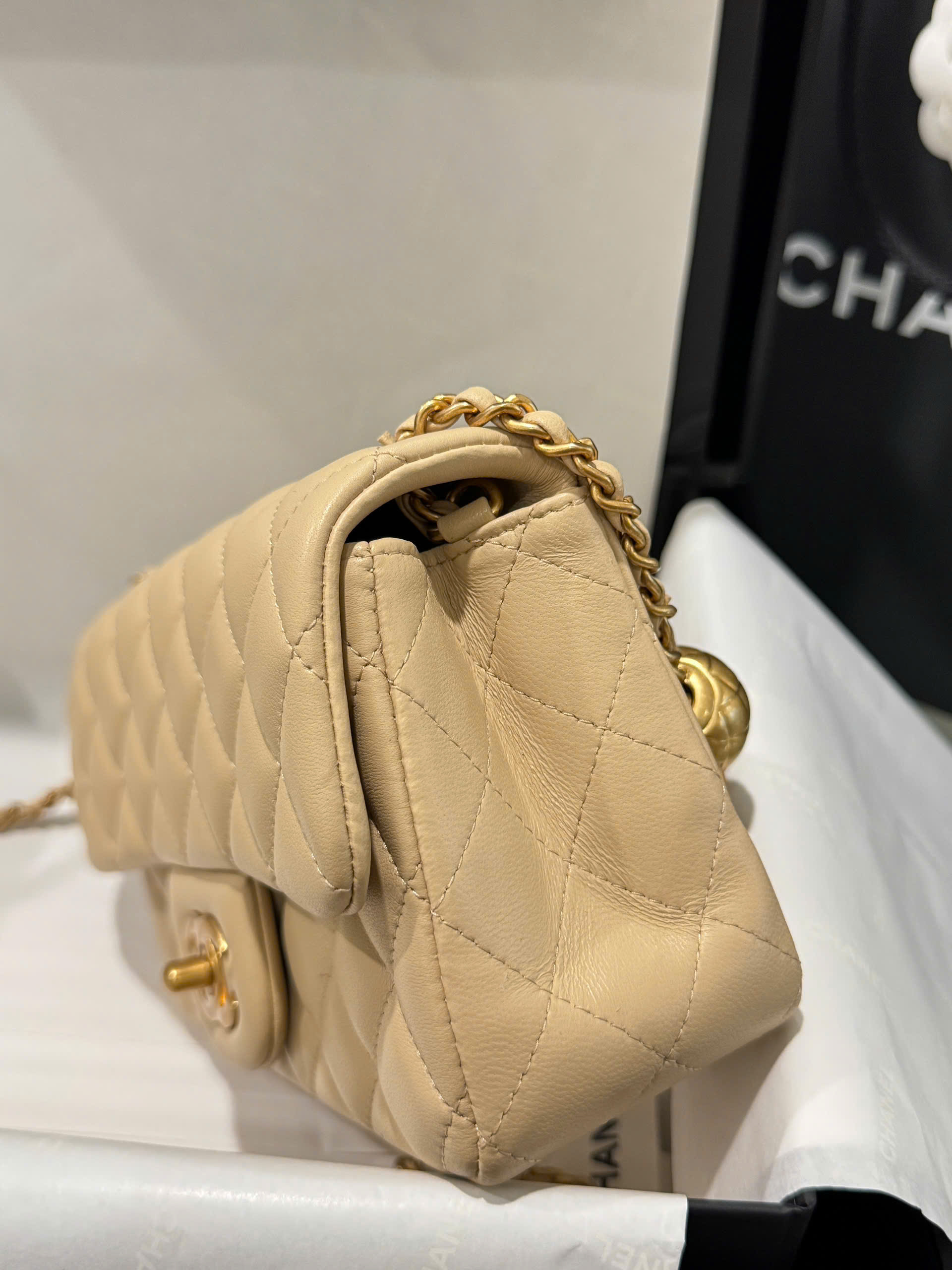 Be the first to review “Chanel Classic Bell Bag 11 Handbags Beige Leather Lock Gold 20cm”