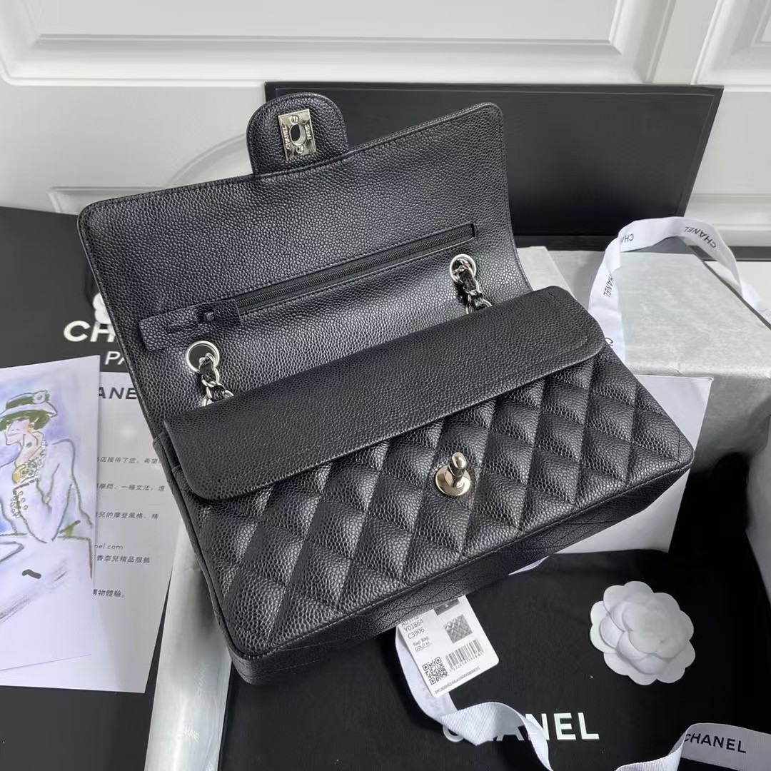 Chanel Classic Handbag Black With Silver Lock 25cm