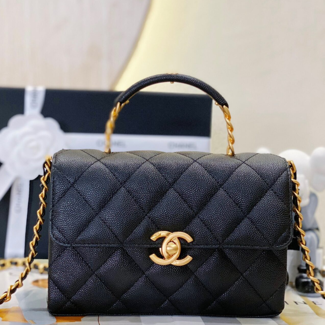 Chanel Handle Woman’s Black Leather Handbags Pebbled Leather 19cm