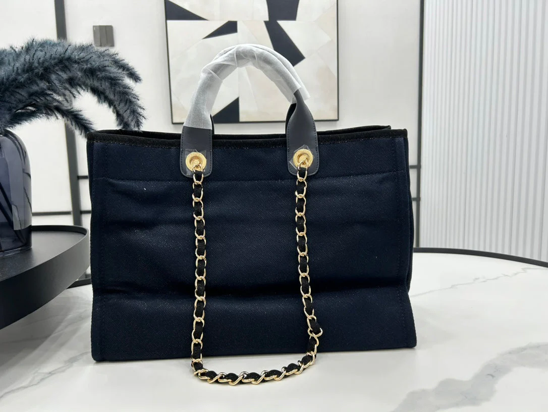CHANEL DEAUVILLE LARGE 38 TOTE BAG IN BLACK CANVAS WITH GOLD EMBROIDERED LOGO