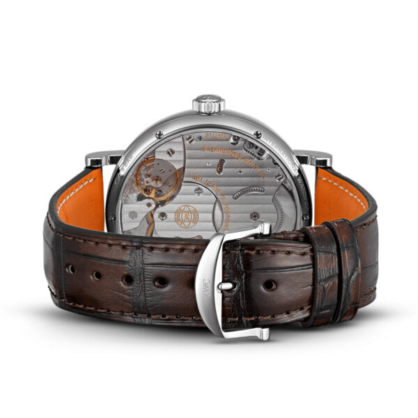 This IWC Portofino Hand-Wound Moon Phase 45mm pays tribute to the original models in the collection, featuring a silver dial that balances a moon phase display, date window, small seconds counter and power reserve display across its face. Housed on a stainless steel case and fitted on a dark brown alligator leather strap made by Italian manufacturer Santoni. In addition, this Portofino is powered by the 59800 Calibre, visible through a saphhire glass back, offering a power reserve of 8 days.