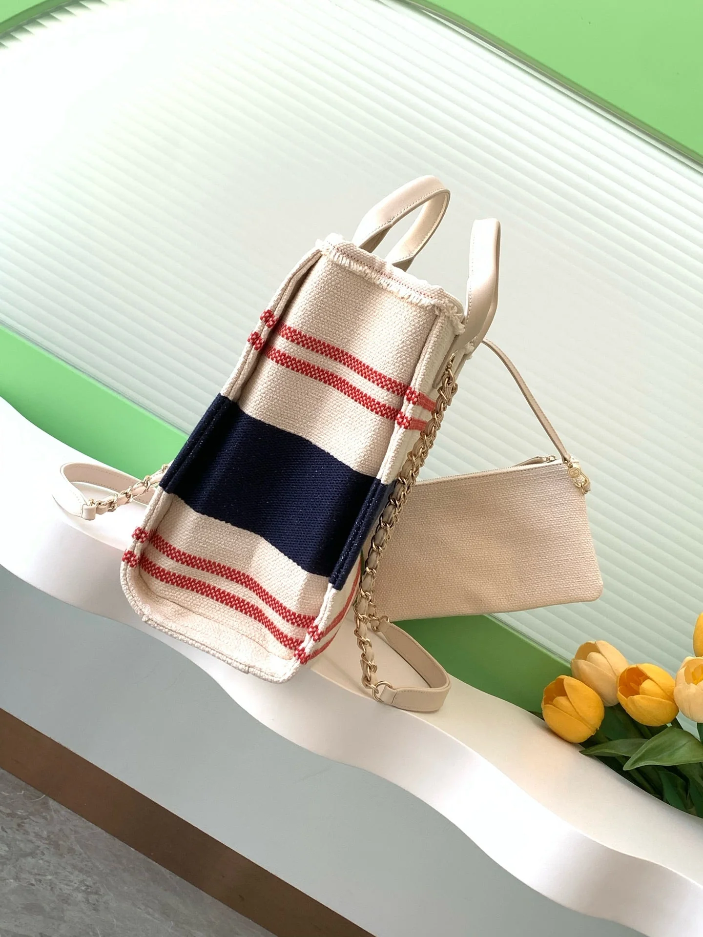 CHANEL SHOPPING BAG 34 IN WHITE RED AND NAVY BLUE CANVAS
